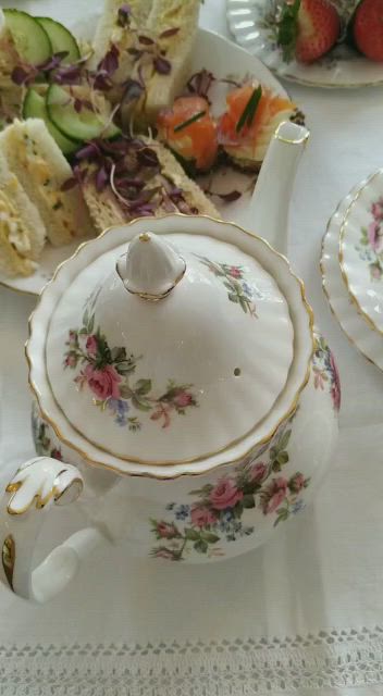 I promised myself at an early age that one day, when I was a grown up, I would have a tea service just like Granny's, and so today, you sip your afternoon tea from Granny's Royal Albert moss rose tea service.
